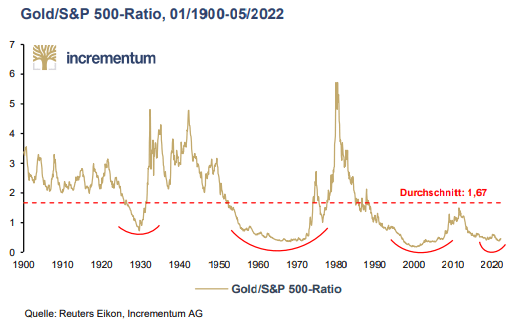Immer wieder werde ich gefragt, ob Gold nicht zu teuer ist, um es noch zu kaufen als Absicherung gegen Inflation und zur Werterhaltung. Um dies auch mal statistisch zu untermauern, habe ich einen interessanten Chart gefunden, welcher seit 122 Jahren den S&P 500, also den Aktienindex aus den USA mit den 500 größten Unternehmen, gegenüber Gold in ein Verhältnis stellt.