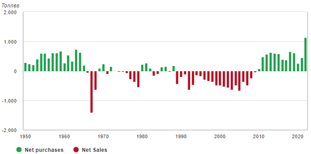 Parallel zum Anstieg der Schulden von Staaten und privaten Haushalten nimmt auch die Goldnachfrage der weltweiten Notenbanken zu. So haben die Zentralbanken im Jahr 2022 die Rekordmenge von mehr als 1.000 Tonnen Gold gekauft. Der höchste jemals erreichte Wert innerhalb der letzten 70 Jahren, wie nachfolgende Grafik zeigt.