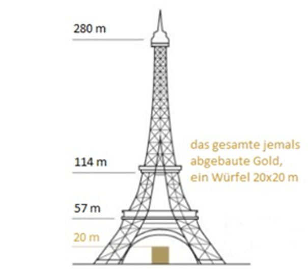 Angebot und Nachfrage bestimmen bei den meisten Dingen den Preis eines Wirtschaftsguts. So der allgemeine Tenor. In Bezug auf Edelmetalle insbesondere Gold möchte ich Ihnen dazu folgende interessante Grafik zeigen. Hier ist der der komplette Bestand an weltweit jemals abgebautem Gold in einem Würfel im Verhältnis zum Eiffelturm in Paris dargestellt! Der Goldwürfel in der Farbe Gold hat eine Kantenlänge von 20x20m. Im plastischen Beispiel sieht man hier den Eiffelturm in Paris mit einer Gesamthöhe von 324 Meter im Vergleich zu der vorhandenen Goldmenge weltweit, welche gerade mal 20 Meter hoch ist.